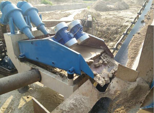 泵漿砂水混合物輸送至泥砂分離器,離心分級濃縮的細砂經沉砂嘴提供給振動篩,經振動篩脫水后,細砂與水有效分離,少量細砂、泥等經返料箱再回到清洗槽,清洗槽液面過高時,經出料口排出。直線振動篩回收物料重量濃度為70%-85%。調節細度模數可以通過改變泵轉速、改變砂漿濃度、調節溢流水量、更換出砂漿嘴來實現。從而完成清洗、脫水和分級三種功能。